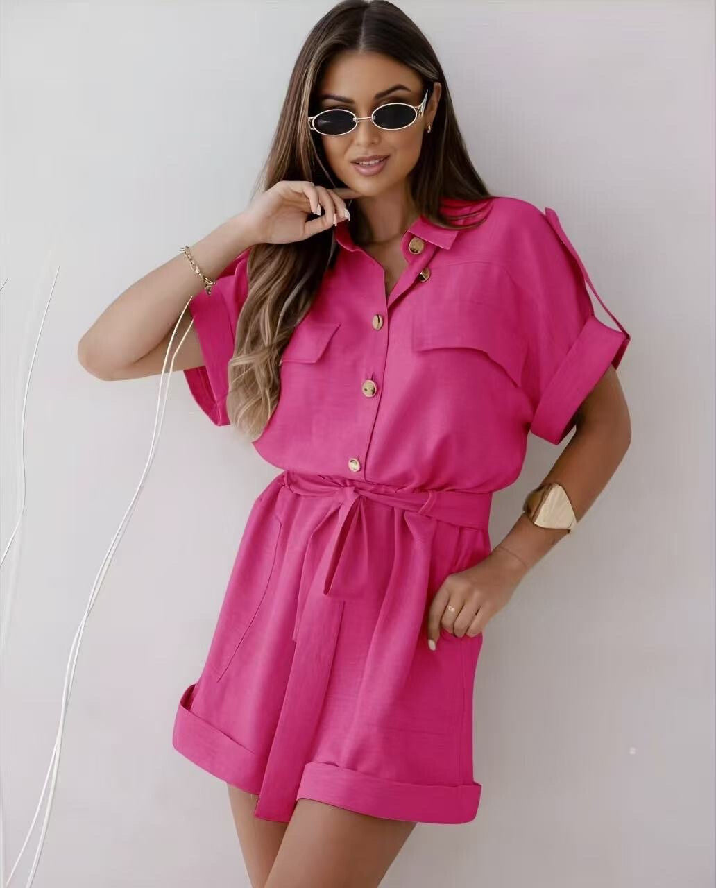 Élégance sans effort avec ce combishort à col chemise, parfait pour allier style et praticité. Ses boutons dorés apportent une touche lumineuse, tandis que la taille élastique avec lien assure un ajustement idéal. Sa coupe fluide garantit un confort absolu, idéal pour une tenue sophistiquée et décontractée.